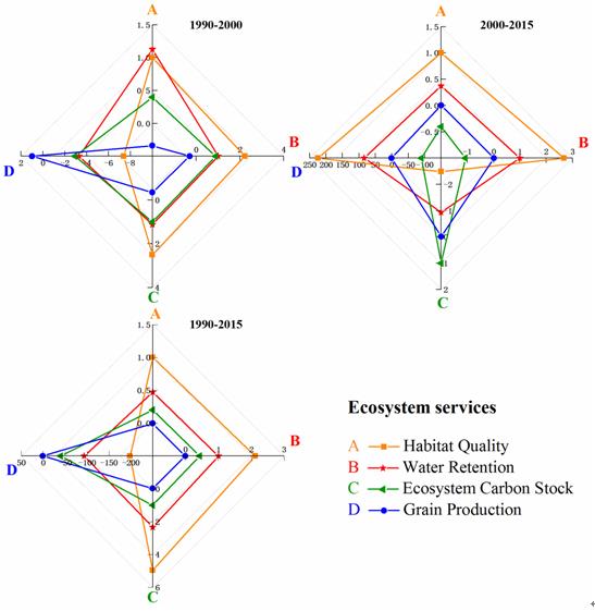 圖1 1990-2015年三江平原生態(tài)系統(tǒng)服務變化:不同等級生境適宜性面積(a)、主要土地覆被類型的水源涵養(yǎng)(b)、主要土地覆被類型的生態(tài)系統(tǒng)碳儲量(c)、糧食產量(d)