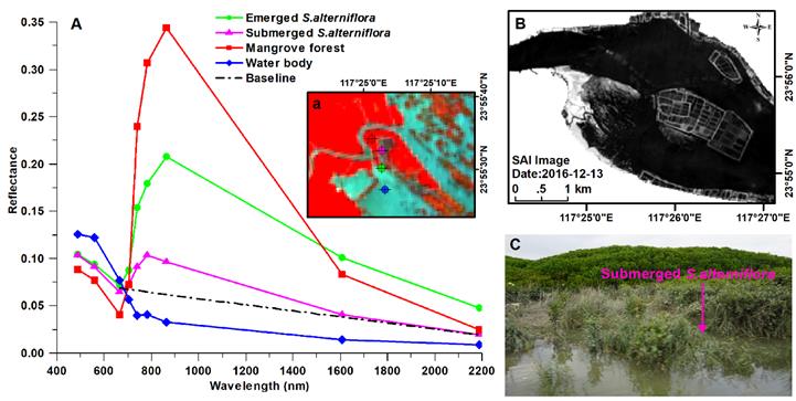 圖1 淹沒互花米草指數(shù)(SAI)建立的基礎(chǔ)。(A) 水面以上的互花米草、淹沒互花米草、紅樹林和水體光譜反射率曲線以及建立SAI的基線;(B)高潮期SAI影像;(C)淹沒互花米草的野外照片。