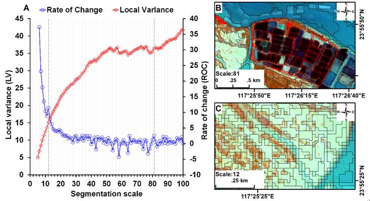 圖2不同對象的最佳分割尺度。(A)局部方差(LV)和變化率(ROC) 隨分割尺度增加的變化;(B)分割尺度為81的分割效果;(C)分割尺度為12的分割效果。