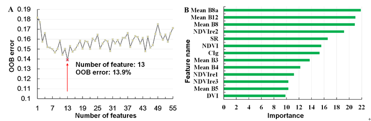 圖3隨機森林分類中最優(yōu)參數(shù)數(shù)量和重要特征
