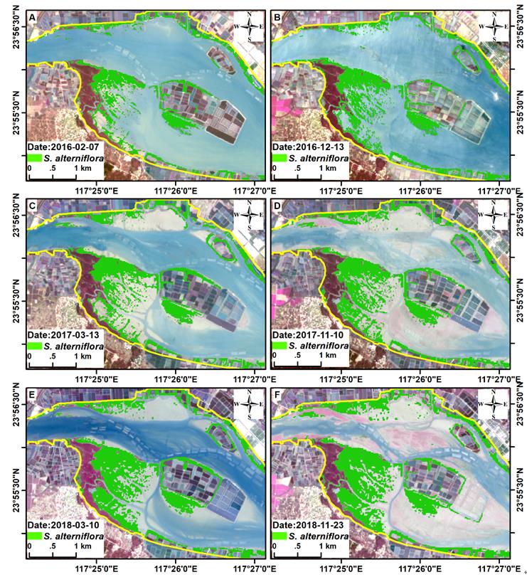 分析互花米草的空間分布(圖4)發(fā)現(xiàn):互花米草主要分布在紅樹林周圍, 2016-2018年,互花米草斑塊聚集性增強。對互花米草的面積變化進行分析發(fā)現(xiàn):互花米草在2016年2月至2018年11月急劇擴張,從151.7公頃增加到270.3公頃,擴張比例達(dá)78%,年入侵率為39.5公頃。互花米草在生長期和休眠期都存在入侵現(xiàn)象,在生長期的入侵率為31.5公頃/季節(jié),在休眠期的入侵率是12.1公頃/季節(jié)。與先前漳江口地區(qū)互花米草入侵研究結(jié)果進行對比,發(fā)現(xiàn),近年來互花米草的入侵進程明顯加快。對互花米草的入侵過程進行季節(jié)性分析,為生態(tài)學(xué)家和環(huán)境管理者了解互花米草的入侵機制提供了新的視角。[3] [n4]