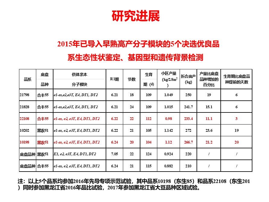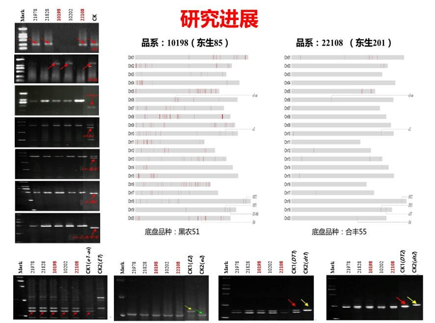 東生83和東生85是中國科學院東北地理與農業(yè)生態(tài)研究所劉寶輝團隊和黑龍江省農科院牡丹江分院大豆研究所任海祥團隊合作育成。東生83是經(jīng)多基因聚合雜交,系譜法選擇育成,成功踐行了基因聚合育種。東生85育成是采用結合分子模塊育種理念,通過將早熟模塊e1-as導入底盤品種黑農51中,并分別經(jīng)芽期和對種子耐旱性表型和分子模塊篩選鑒定為2級耐旱初級分子模塊設計型突破性品種。