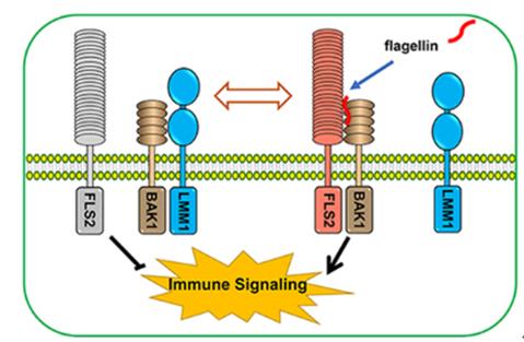 無(wú)病原菌侵入時(shí),GmLMM1與病原體模式識(shí)別受體BAK1結(jié)合,免疫反應(yīng)被抑制;當(dāng)病原菌(flagellin)侵入植物細(xì)胞后,可以誘導(dǎo)病原菌特異模式識(shí)別受體FLS2和BAK1結(jié)合,以觸發(fā)下游免疫信號(hào)。 GmLMM1在免疫激活過(guò)程中可以調(diào)節(jié)FLS2-BAK1相互作用,從而控制適度的免疫激活。