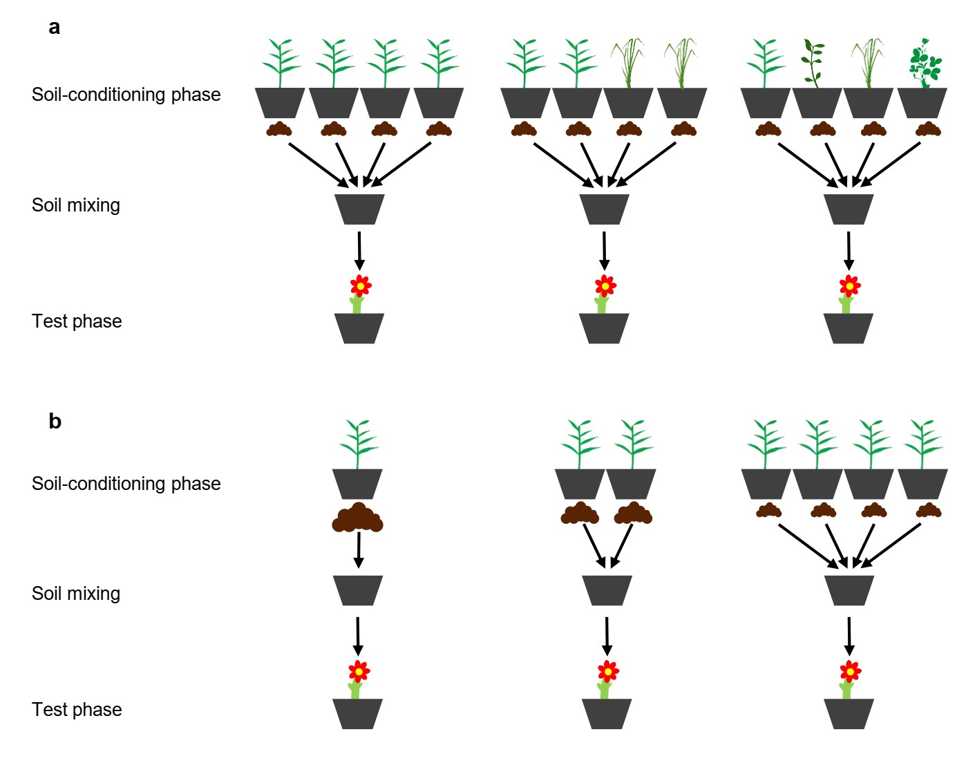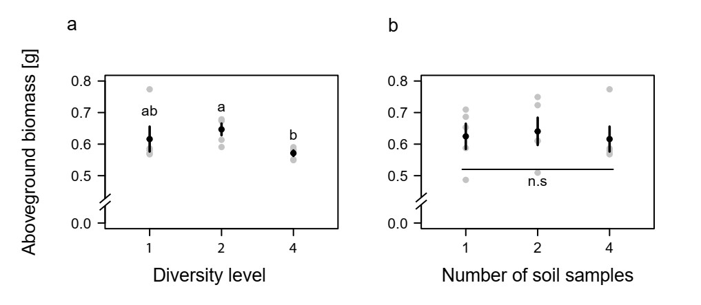針對(duì)以上研究缺口,中科院東北地理與農(nóng)業(yè)生態(tài)研究所生物入侵生態(tài)學(xué)研究團(tuán)隊(duì)與德國(guó)康斯坦茨大學(xué)生態(tài)學(xué)研究團(tuán)隊(duì)借鑒植物-土壤反饋的研究方法,利用溫室控制實(shí)驗(yàn),探究了本地植物多樣性如何通過(guò)土壤微生物調(diào)控外來(lái)植物的入侵過(guò)程。實(shí)驗(yàn)第一階段,研究人員利用不同的本地植物物種馴化土壤微生物群落,并測(cè)定了不同植物馴化后的土壤微生物群落多樣性。實(shí)驗(yàn)第二階段,研究人員將來(lái)自不同植物馴化過(guò)的土壤人工混合,組成不同的植物多樣性梯度的馴化土壤(分別是多樣性1、2和4),然后在這些土壤里種植外來(lái)植物,并測(cè)定其生長(zhǎng)表現(xiàn)。