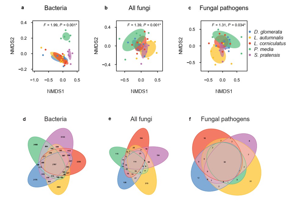 圖三 不同本地植物馴化過(guò)的土壤細(xì)菌(a,d),真菌(b,e)和真菌病原體(c,f)群落組成的差異(β多樣性和非共享的ASV)。不同顏色代表不同本地植物。NMDS圖中,不同點(diǎn)代表土壤樣品。