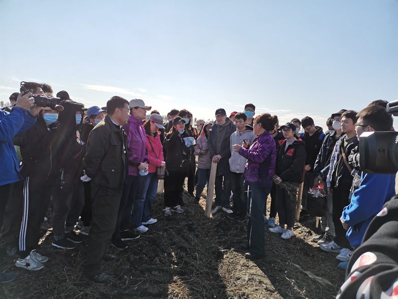 測(cè)產(chǎn)之前,李艷華為前來(lái)實(shí)習(xí)的黑龍江大學(xué)學(xué)生現(xiàn)場(chǎng)講解了測(cè)產(chǎn)原理和意義。