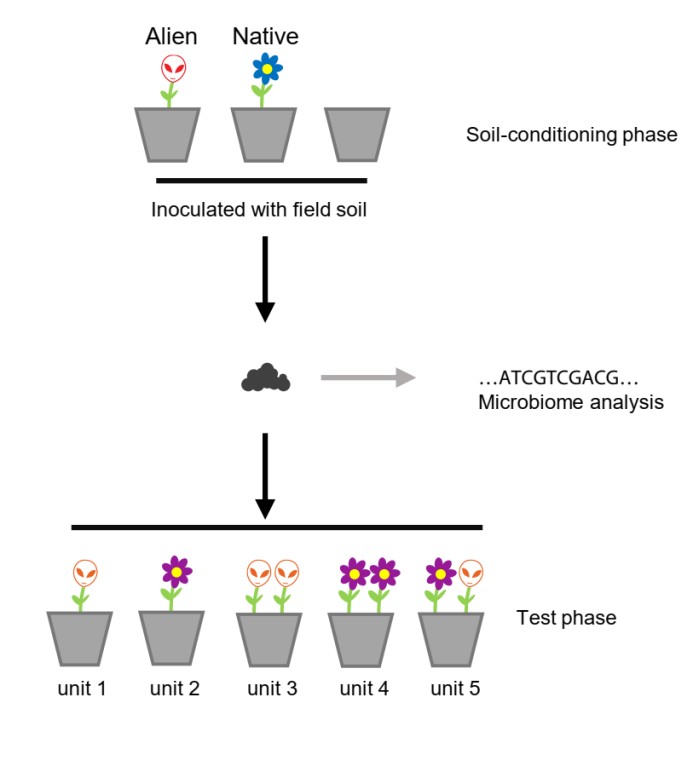 研究人員利用植物-土壤反饋的研究手段(圖1),在第一階段,選擇了4種外來植物和6種本地植物分別對土壤進行了馴化(即隨著植物的生長,它會改變土壤微生物的構(gòu)成),并設(shè)置了一個沒有植物的對照。植物生長15周后,研究人員收獲了土壤,并采樣進行擴增子測序得到土壤細(xì)菌和真菌的群落結(jié)構(gòu)。在第二階段,研究人員將新一批植物(5種外來植物和5種本地植物)種在了收獲的土壤,共設(shè)置了5個競爭處理:外來/本地種的單種,外來/本地種的單物種種群,以及外來本地種的混種群落。