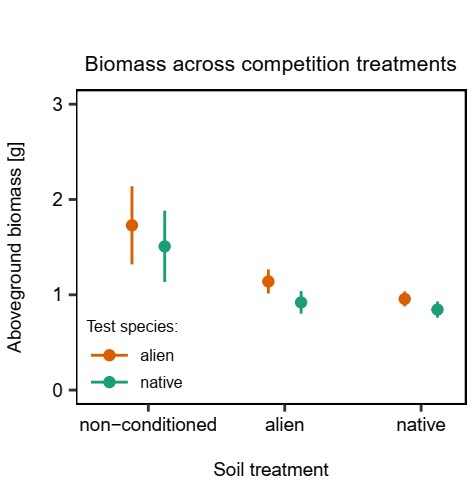 外來入侵生物造成的生態(tài)破壞與經(jīng)濟損失使得我們急需探究外來種成功入侵的原因。長久以來,高競爭能力一直被認(rèn)為是外來種成功入侵的關(guān)鍵。但是過去的研究大多關(guān)注兩物種競爭(一個本地種與一個外來種的競爭),很少探究多物種的競爭。此外,競爭有不同的類型,被廣泛研究的是對資源的競爭,但是競爭也可以通過其它營養(yǎng)級產(chǎn)生。因此,中國科學(xué)院東北地理與農(nóng)業(yè)生態(tài)研究所生物入侵生態(tài)學(xué)研究團隊與德國康斯坦茨大學(xué)生態(tài)學(xué)研究團隊通過實驗旨在研究第三個物種是否會通過改變土壤微生物來改變外來種和本地種的競爭結(jié)果。