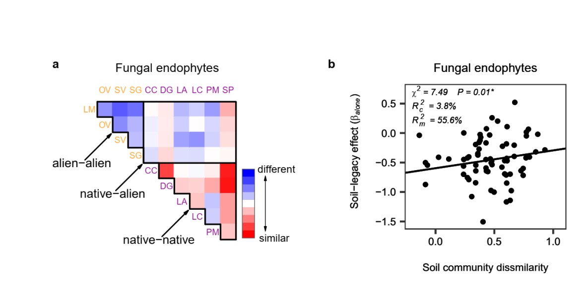 圖3 不同植物土壤微生物群落的相似度(a)。藍色代表相似度低,紅色代表相似度高。左上角為外來植物之間的相似度,右下角為本地植物之間的相似度,中間為外來植物與本地植物之間的相似度。土壤微生物群落相似度與土壤遺留效應(yīng)的關(guān)系(b)。正的土壤遺留效應(yīng)代表植物對土壤馴化促進后來植物的生長。本圖僅展示內(nèi)生真菌,細(xì)菌,整體真菌的結(jié)果具有相同趨勢,但不顯著,具體可見原文。