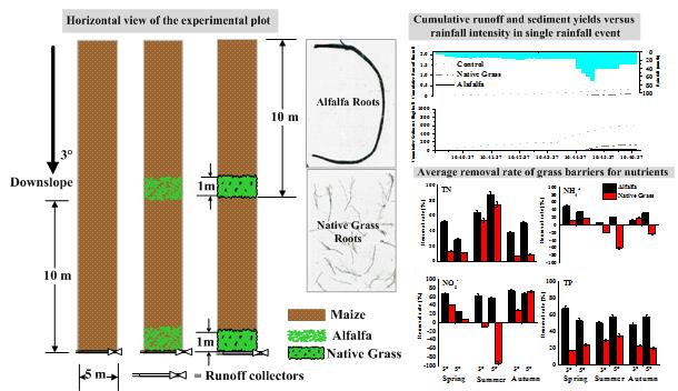 東北黑土區(qū)是中國(guó)重要的糧食核心產(chǎn)區(qū)和最大的商品糧生產(chǎn)基地,由于坡地被大量墾殖,水土流失逐年加劇,造成了嚴(yán)重的農(nóng)業(yè)面源污染。目前采用的最佳管理措施(BMPs),如壟作區(qū)田、地埂、魚鱗坑等,多以水土保持為目標(biāo)進(jìn)行設(shè)計(jì),對(duì)于污染的削減主要通過大量攔截泥沙、徑流來實(shí)現(xiàn)。這些措施可能造成上游來水銳減,影響下游河流和湖庫的水生態(tài)質(zhì)量,尤其是在水源地流域,入庫徑流的減少可能造成水質(zhì)進(jìn)一步惡化、供水保證率降低,給下游居民的生產(chǎn)、生活用水帶來困難。為此,東北地理所水環(huán)境污染與防治學(xué)科組科研人員研發(fā)了新型等高植物草籬技術(shù),并利用在吉林省遼源市東遼縣杏木國(guó)家級(jí)水土保持示范園區(qū)內(nèi)的標(biāo)準(zhǔn)小區(qū),開展了草籬污染物削減能力實(shí)地監(jiān)測(cè)與模型模擬驗(yàn)證工作。