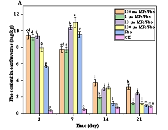 圖1. 菲 (A)和熒光微塑料(B)在蚯蚓體內(nèi)的含量。不同字母表示差異顯著(p < 0.05)。