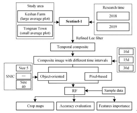 研究人員對研究區(qū)作物生長季(5月-9月)的Sentinel-1影像按三種時間間隔(10d、15d和30d)進行合成;然后使用簡單非迭代聚類算法(SNIC)對合成影像按照不同空間尺度進行分割,最后將訓練樣點和經(jīng)過不同處理的影像輸入隨機森林分類器進行作物分類(圖1)。