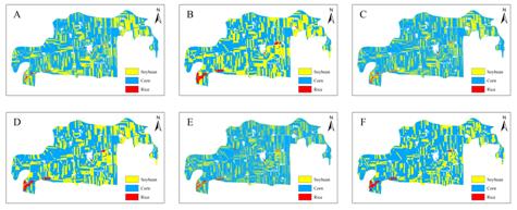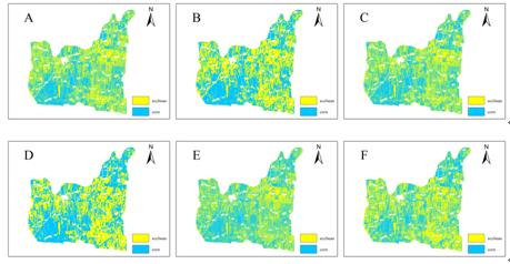 圖3 不同處理方式下通南鎮(zhèn)作物分類結果(A-F)