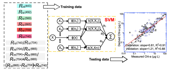 目前,葉綠素a定量遙感研究多集中于分析算法、經(jīng)驗(yàn)算法和半分析算法,雖然在一些湖泊案例應(yīng)用取得較好的反演精度,但這些算法易受到區(qū)域背景環(huán)境條件和大氣組成成分影響。隨著人工智能—機(jī)器學(xué)習(xí)算法的發(fā)展,開辟葉綠素a定量遙感技術(shù)的新思路。因此,中國科學(xué)院東北地理與農(nóng)業(yè)生態(tài)研究所水環(huán)境遙感學(xué)科組的科研人員們在2017-2019年采集中國典型45個(gè)湖泊的水體樣品,共計(jì)獲取273個(gè)實(shí)測葉綠素a濃度值,基于哨兵2號衛(wèi)星反射率數(shù)據(jù)(Sentinel-2 A/B MSI)和葉綠素a敏感波段組合數(shù)據(jù)集,借助機(jī)器學(xué)習(xí)算法,訓(xùn)練和驗(yàn)證葉綠素a反演模型,取得較高的反演精度。研究結(jié)果表明,線性回歸(LR)、支持向量機(jī)(SVM)和Catboost機(jī)器算法均獲取比傳統(tǒng)葉綠素a經(jīng)驗(yàn)算法較高的反演精度。其中,SVM獲取更穩(wěn)健的模型反演效果(訓(xùn)練和驗(yàn)證結(jié)果:R2>0.88),并在低懸浮物濃度、高DOC濃度的湖泊水體中反演效果更佳。此外,研究結(jié)果還表明機(jī)器學(xué)習(xí)算法在中國大尺度湖泊葉綠素a定量遙感研究中具有應(yīng)用潛力,為中國湖泊葉綠素a定量遙感和富營養(yǎng)化監(jiān)測提供技術(shù)支撐。