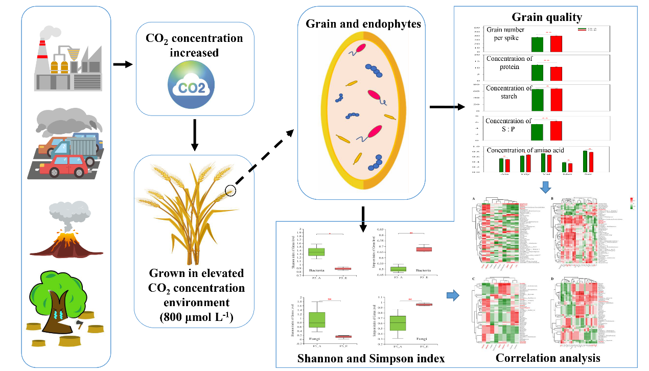 大氣中CO2濃度從工業(yè)革命前的280 μmol L-1增加到了2019年的409.8 μmol L-1,預(yù)計在2100年上升至900 μmol mol-1左右。大氣CO2濃度升高會直接影響小麥碳氮代謝和籽粒化學(xué)成分,從而顯著影響小麥籽粒品質(zhì)。植物內(nèi)生微生物在作物響應(yīng)氣候變化方面起了關(guān)鍵作用,微生物種類、豐度的改變與寄主植物生長發(fā)育密切相關(guān)。籽粒內(nèi)生菌多樣性對植物的環(huán)境響應(yīng)能力和生產(chǎn)力具有重要影響。然而,在未來大氣CO2升高的環(huán)境條件下,籽粒內(nèi)生微生物多樣性與小麥的品質(zhì)形成之間的關(guān)系仍未可知。為此,東北地理所科研人員將小麥連續(xù)5代進行高CO2濃度處理后收獲籽粒,分析了小麥籽粒品質(zhì)與籽粒內(nèi)生微生物多樣性之間的關(guān)系。
