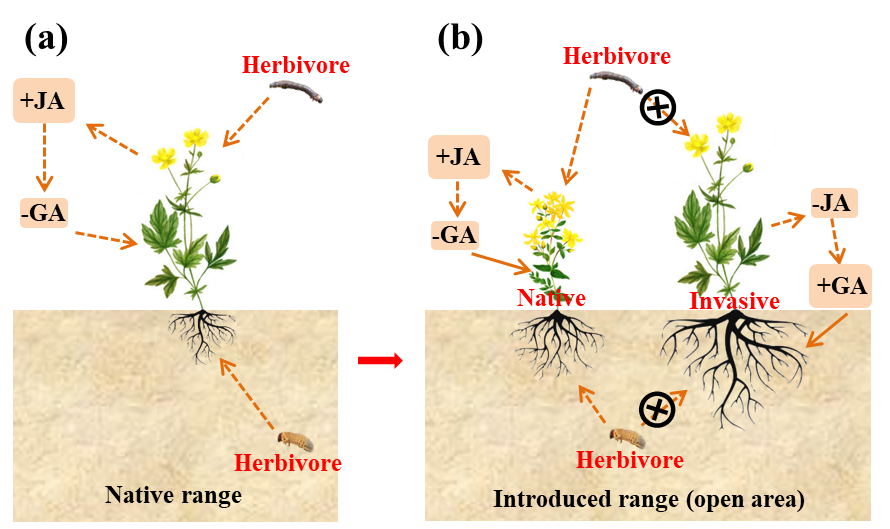 植物體內(nèi)諸多激素能夠調(diào)控自身的生長發(fā)育、以及對天敵的防御。其中,赤霉素和茉莉酸是非常重要的一對拮抗調(diào)控植物生長和防御的激素。基于此認(rèn)知,結(jié)合天敵逃逸假說,生物入侵生態(tài)學(xué)學(xué)科組劉艷杰研究員(第一作者)與臺州學(xué)院于飛海教授(通訊作者)從激素調(diào)控外來植物生長和防御權(quán)衡方面提出一個(gè)新的概念模型(圖1)——由于入侵植物在引入地逃逸掉許多專食性天敵采食,其茉莉酸途徑會下調(diào)降低植物防御投資,赤霉素途徑上調(diào)提高生長投資;而由于受到更多天敵采食,本地植物則茉莉酸途徑上調(diào)增加防御,赤霉素途徑下調(diào)減小生長。因此,入侵植物比本地植物更具生長優(yōu)勢。