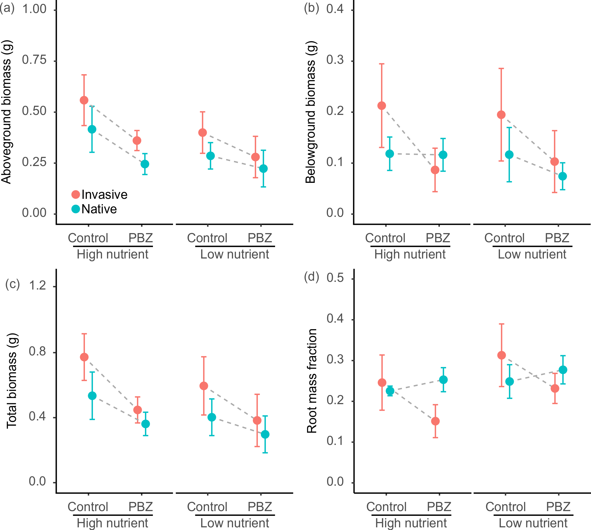 圖2 不同水平多效唑(PBZ:赤霉素合成抑制劑)和養(yǎng)分處理對入侵植物和本地植物(a) 地上生物量,(b) 地下生物量,(c) 總生物量,和 (d) 根質(zhì)量分?jǐn)?shù)的影響