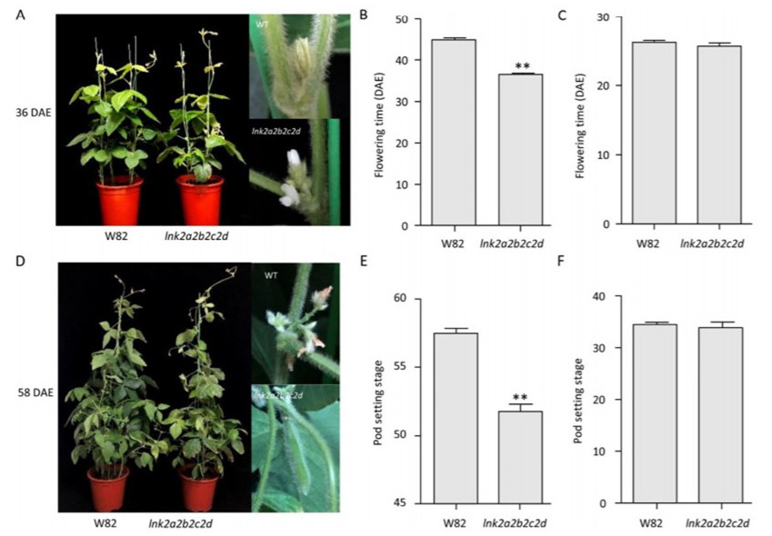 李趙博博士利用全基因組關聯(lián)分析(Genome-wide association studies, GWAS)技術與擬南芥重要生物鐘基因進行同源比對的方法,在大豆中鑒定到一調(diào)控開花期新基因LNK2 (Night light-inducible and clock-regulated 2)。利用CRISPR/Cas9開發(fā)出LNK2基因的轉基因四重純合突變體,在長日照條件下,四重突變體的開花時間明顯早于野生型(圖2)。熒光定量PCR顯示,在長日照條件下,LNK2的轉錄水平明顯低于野生型。LNK2促進了豆類特異性E1基因的表達,并抑制了開花素FT2a的表達。這些結果表明,CRISPR/CAs9介導的4個LNK2基因的靶向突變縮短了大豆的開花時間。