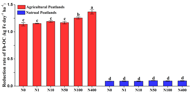 鐵作為泥炭沼澤有機(jī)碳輸出的重要載體,認(rèn)識(shí)鐵還原機(jī)制對(duì)理解泥炭地有機(jī)碳輸出具有重要意義。通過模擬實(shí)驗(yàn)發(fā)現(xiàn),高氮處理(100與400mgkg-1)顯著改變了墾殖泥炭地土壤鐵還原菌群落組成、增加鐵還原菌豐度,導(dǎo)致鐵還原量顯著高于低氮處理(0.09-0.2kgFeday-1ha-1),而且墾殖泥炭地鐵還原量遠(yuǎn)遠(yuǎn)高于天然泥炭地(圖2)。增加的可溶性鐵能夠與酚類物質(zhì)形成相對(duì)穩(wěn)定的可溶性復(fù)合物,潛在地促進(jìn)墾殖泥炭地鐵與有機(jī)碳持續(xù)輸出。