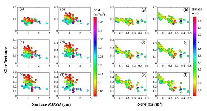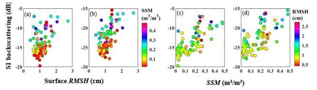 圖2. Sentinel-1后向散射系數(shù)與SSM和RMSH的關(guān)系。
