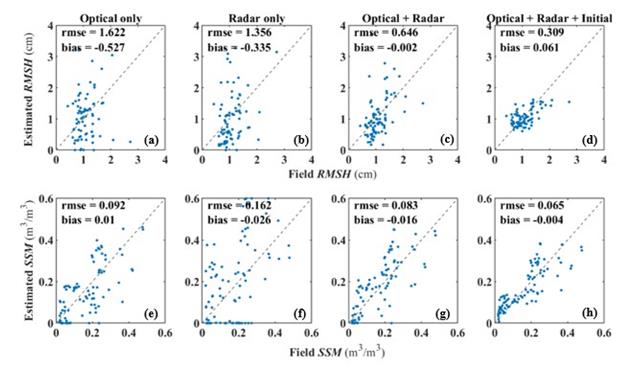 雷達(dá)具有穿云透霧、全天候全天時(shí)工作的特點(diǎn),被認(rèn)為是全球或區(qū)域尺度獲取土壤水分時(shí)空變化的最佳手段。在實(shí)際應(yīng)用中,雷達(dá)信號(hào)受土壤含水量、植被含水量、土壤質(zhì)地、土壤表面粗糙度等多因素影響。對于裸露土壤表面,表層土壤水分和表面粗糙度是影響雷達(dá)信號(hào)的主要因素,為了實(shí)現(xiàn)裸土表面的高精度土壤水分估算,東北地理所微波遙感團(tuán)隊(duì)開發(fā)了一種聯(lián)合光學(xué)和雷達(dá)數(shù)據(jù)同時(shí)估算土壤含水量(SSM)和表面粗糙度(RMSH)的方法,以減弱表面粗糙度對SSM反演結(jié)果的影響。圖1為表面土壤水分和地表粗糙度對光譜反射率的影響,圖2為表面土壤水分和地表粗糙度對后向散射系數(shù)的影響。研究團(tuán)隊(duì)構(gòu)建了土壤含水量、表面粗糙度與光譜反射率(與雷達(dá)后向散射系數(shù))之間的半經(jīng)驗(yàn)關(guān)系,利用偏最小二乘法同時(shí)估算了土壤水分和表面粗糙度。在此基礎(chǔ)上,通過引入土壤水分和表面粗糙度初始值,限制土壤水分和表面粗糙度的值域,避免SSM和RMSH估計(jì)值陷入局部最優(yōu)解,進(jìn)一步提高了反演精度(圖3)。