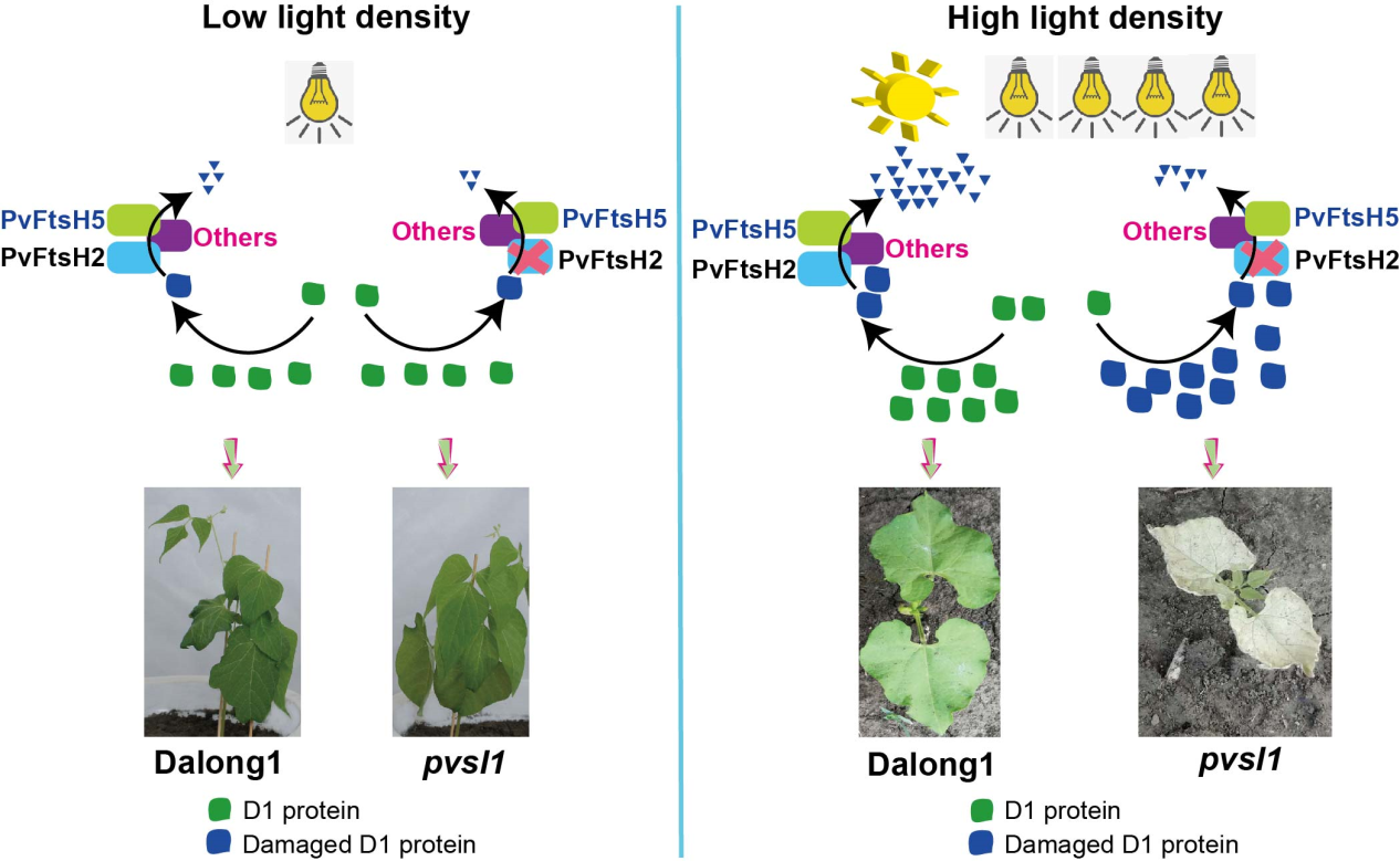 東北地理所夏正俊課題組在Horticulture Research上發(fā)表了題為A critical role of PvFtsH2 in the degradation of photodamaged D1 protein in common bean的研究論文。本研究以中國菜豆品種大龍1號為背景材料,在60Co輻射創(chuàng)制突變體材料中發(fā)現(xiàn)一幼苗致死的pvsl1突變體,該突變體出苗后在田間或高光強(qiáng)下2周內(nèi)死亡;在溫室中低光強(qiáng)下則表現(xiàn)為失綠表型,還可正常開花結(jié)實。經(jīng)INDEL分子標(biāo)記將PvSL1候選基因定位在2號染色體53.7 kb區(qū)域內(nèi),候選基因Phvul.002G190900的CDS區(qū)域在pvsl1突變體中發(fā)生了1 bp的缺失,導(dǎo)致蛋白翻譯提前終止。Phvul.002G190900基因(PvFtsH2)的表達(dá)量隨光強(qiáng)增強(qiáng)而上調(diào),在pvsl1突變體中其表達(dá)量明顯下調(diào)。pvsl1突變體中PvFtsH2蛋白功能的喪失導(dǎo)致高光強(qiáng)下受損傷的D1蛋白不能被及時降解清除、造成PSⅡ的不可逆損害,使得光合作用能力下降、葉片細(xì)胞死亡,進(jìn)而引致植株整體死亡。在pvsl1突變體中PvFtsH5和PvFtsH8的表達(dá)量上調(diào),暗示其他FtsH家族成員亦具有部分補(bǔ)償PvFtsH2降解清除光損傷D1蛋白的能力,使得pvsl1突變體在低光強(qiáng)下能夠完成營養(yǎng)生殖生長。該研究結(jié)果揭示了PvFtsH2蛋白對確保菜豆光合系統(tǒng)在強(qiáng)光下正常運轉(zhuǎn)發(fā)揮著重要的功能。