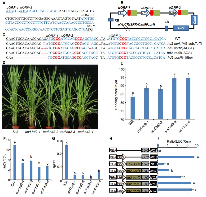 為了利用基因編輯手段提高靶基因的表達(dá)量,該團(tuán)隊(duì)擬對基因的上游開放閱讀框架(open reading frames, uORFs)進(jìn)行編輯。研究表明,uORFs可以抑制開放閱讀框架(primary ORFs, pORFs)的翻譯,通過編輯和突變這些uORFs可以達(dá)到提高pORFs的蛋白水平的目的。本實(shí)驗(yàn)室前期研究發(fā)現(xiàn)Hd2是控制東北水稻開花最重要的抑制子之一,序列分析發(fā)現(xiàn)Hd2在5'UTR區(qū)域存在3個uORF,因此,該研究團(tuán)隊(duì)針對3個uORF分別設(shè)計3個靶位點(diǎn)進(jìn)行基因編輯,獲得了多種不同編輯類型,抽穗期統(tǒng)計結(jié)果顯示,突變體出現(xiàn)不同程度晚花(4.6天-11.2天),其中第一個uORF突變的晚花效果最明顯。突變體中,抽穗期基因Ehd1、Hd3a和RFT1的表達(dá)量都低于野生型,與其晚花表型一致。進(jìn)一步將Hd2 uORF與4種突變類型uorf插入到35S啟動子與LUC報告基因之間,瞬時轉(zhuǎn)化原生質(zhì)體,發(fā)現(xiàn)Hd2 uORF的突變與否并不影響報告基因LUC的轉(zhuǎn)錄水平,但是Hd2 uORF的插入顯著降低了LUC的熒光信號,而uorf的突變可以不同程度的恢復(fù)LUC的蛋白量,證實(shí)了Hd2 uORF的突變可以通過提高Hd2 pORF的翻譯達(dá)到增強(qiáng)Hd2功能的效果,從而實(shí)現(xiàn)不同程度延遲開花的目的,這表明對于Hd2 uORF的編輯突變可以作為未來微效改變水稻開花性狀的有效靶點(diǎn)。