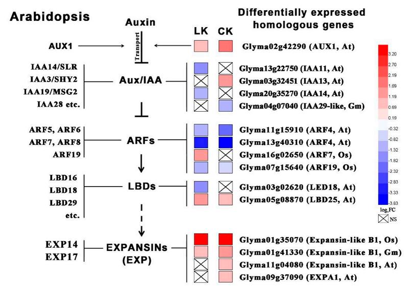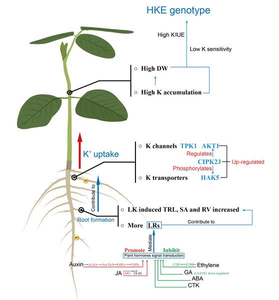 基于以上科學問題,大豆分子育種學科組張秋英研究員團隊通過對40個不同鮮食大豆品種(系)進行了鉀效率鑒定試驗,從中篩選出了代表性的鉀高效型材料進行了進一步的形態(tài)生理特征及其內(nèi)在機制解析。研究發(fā)現(xiàn),從鉀素的利用角度,低鉀條件下鉀高效型品種對鉀素的積累及干物質(zhì)的分配調(diào)控能力更強,表現(xiàn)出優(yōu)先供給庫器官,因而具有較高的收獲指數(shù)(HI)及鉀收獲指數(shù)(KHI)(圖1)。同時,低鉀對鉀高效型品種的光合參數(shù)、葉面積影響較小,對比葉重影響較大,促進葉綠素a/葉綠素b比值顯著增加。因此,低鉀環(huán)境下的強適應性及調(diào)節(jié)能力是影響鮮食大豆鉀素利用效率的關鍵;鉀素的吸收效率方面,鉀高效型鮮食大豆應對低鉀環(huán)境其根系的形態(tài)調(diào)節(jié)能力更強,通過增加總根長及側(cè)根數(shù)來增加根系與土壤的接觸面積,如鉀高效型材料側(cè)根數(shù)相比對照材料可高出30%,進而增強了植株鉀素的獲取能力。同時,鉀高效型材料的單位根長吸鉀量更高(圖2),在低鉀環(huán)境下根系活力、傷流量與鉀流量顯著增加,進一步保證了鉀素、水分及營養(yǎng)物的供應。轉(zhuǎn)錄組分析結果顯示,鉀高效型鮮食大豆根系在低鉀條件下受生長素信號調(diào)控的側(cè)根發(fā)育通路存在正向調(diào)控(圖3),同時與鉀素吸收利用密切相關的鉀離子通道基因AKT1及鉀轉(zhuǎn)運體基因HAK5基因的同源基因在鉀高效型材料根系中高量表達,這可能是影響根系形態(tài)調(diào)節(jié)及鉀離子吸收動力增加的重要內(nèi)因(圖4)。以上研究結果將為鉀高效型作物品種選育提供理論依據(jù),進而也為實現(xiàn)黑土保育、資源高效持續(xù)利用提供重要支撐。