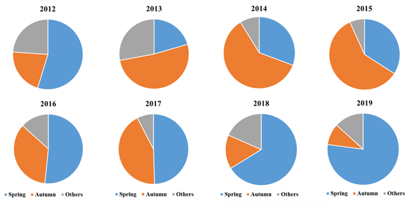 圖1. 2012-2019年?yáng)|北地區(qū)生物質(zhì)燃燒在春耕前、秋收后及其他時(shí)間的比例