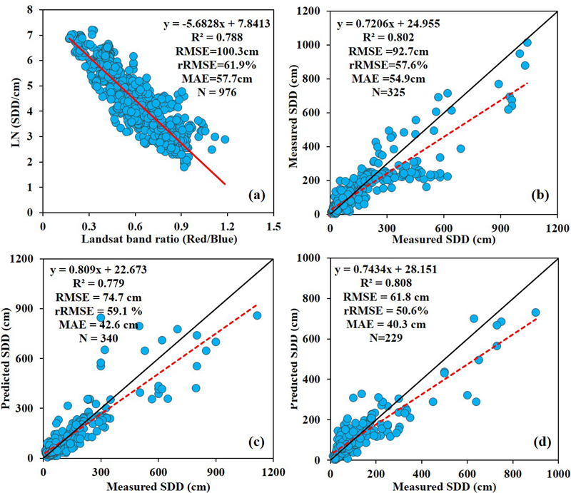 圖1 基于三種實(shí)測(cè)透明度數(shù)據(jù)集和Landat TOA反射率構(gòu)建、驗(yàn)證中國(guó)湖泊透明度反演模型,(a)2004-2018年實(shí)測(cè)透明度數(shù)據(jù)集的3/4用來(lái)構(gòu)建模型,(b)1/4用來(lái)驗(yàn)證模型,(c)2007-2009年湖泊調(diào)查實(shí)測(cè)透明度模型驗(yàn)證,(d)1985-1990年第一次湖泊調(diào)查實(shí)測(cè)透明度模型驗(yàn)證。