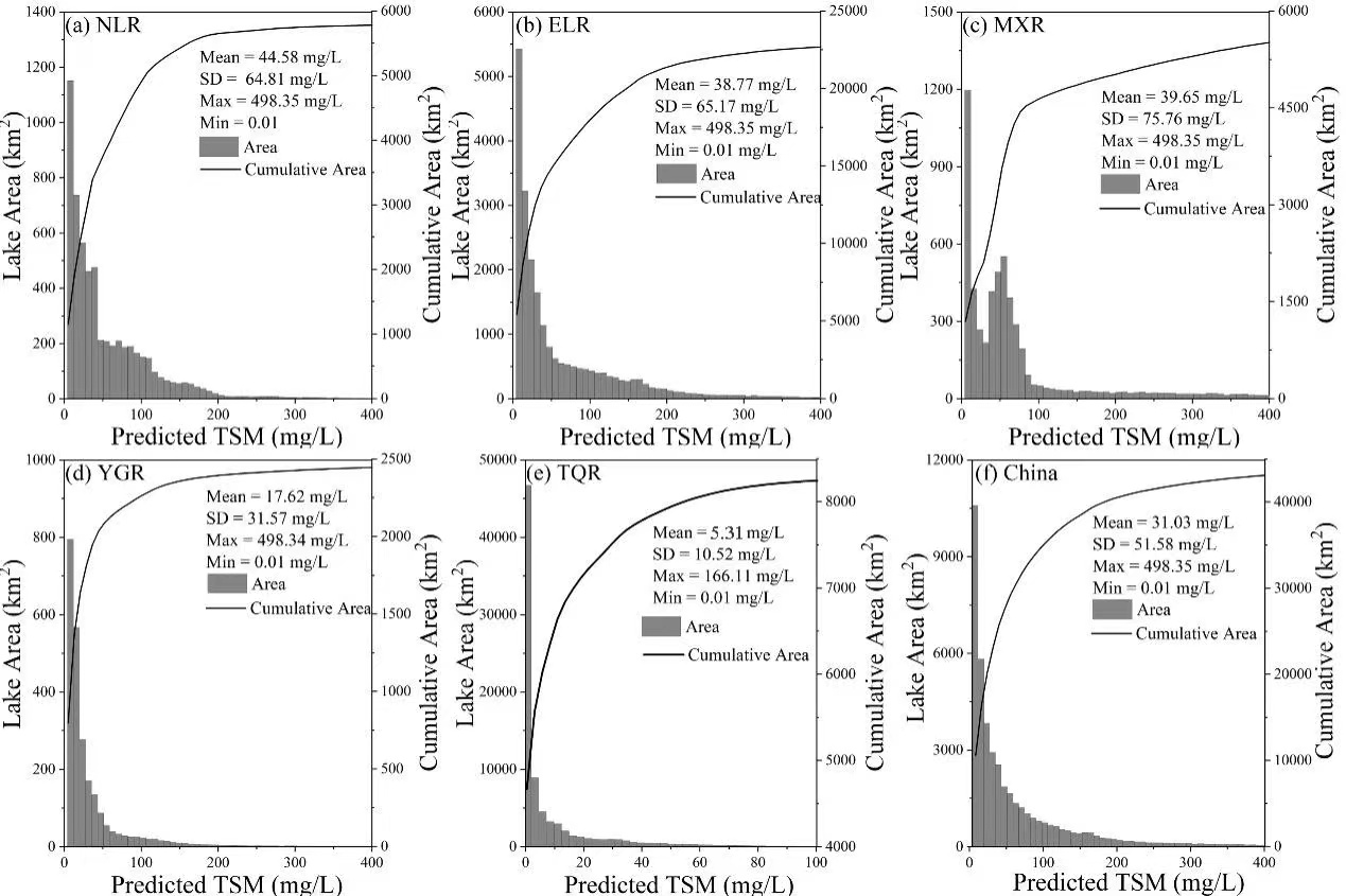 圖1 中國不同湖區(qū)湖泊水體TSM反演濃度直方圖. (a) NLR-東北湖區(qū),(b) ELR-東部湖區(qū),(c) MXR-蒙新湖區(qū),(d) YGR-云貴湖區(qū),(e) TQR-青藏高原湖區(qū),(f) 全中國湖泊.