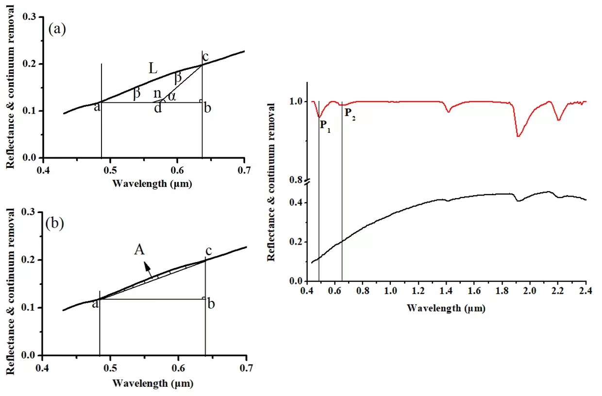 光譜特征參數(shù)是對光譜曲線吸收特征的描述,在土壤屬性預(yù)測和土壤分類中被很多廣泛使用。對于土壤分類,因不同土壤的理化性質(zhì)差異會引起土壤在不同波長上的光譜反射差異,光譜特征參數(shù)可以有效的區(qū)分不同土壤類型。但對于土壤屬性預(yù)測,光譜特征參數(shù)的使用不如光譜微分和數(shù)學(xué)變換普遍,而且使用的光譜特征參數(shù)都是基于包絡(luò)線去除后提取的吸收深度、吸收面積或吸收位置等。本研究發(fā)現(xiàn),對于低有機質(zhì)含量的土壤,隨著SOM含量的變化,在土壤反射光譜曲線上的可見光部分具有較明顯的形狀變化。