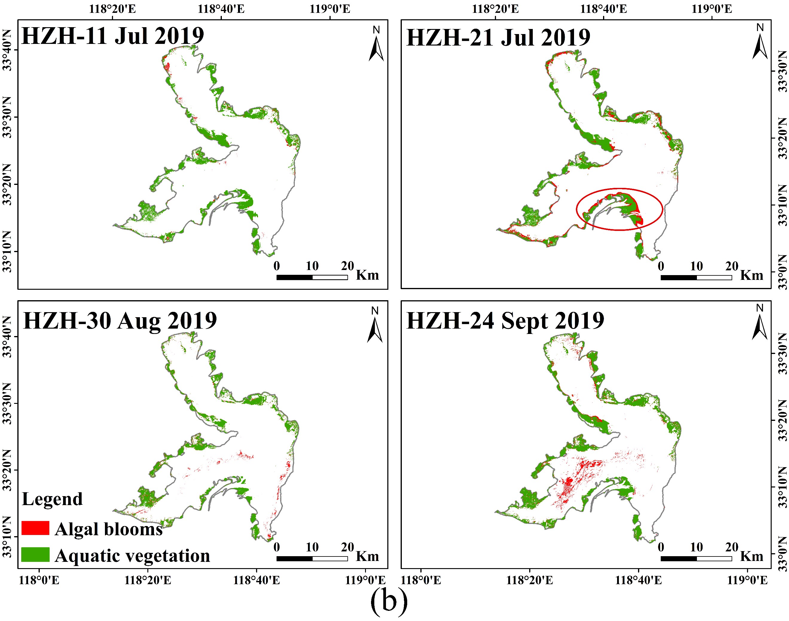 圖1 湖泊藻華和水生植被識別結果,a)呼倫湖;b)洪澤湖