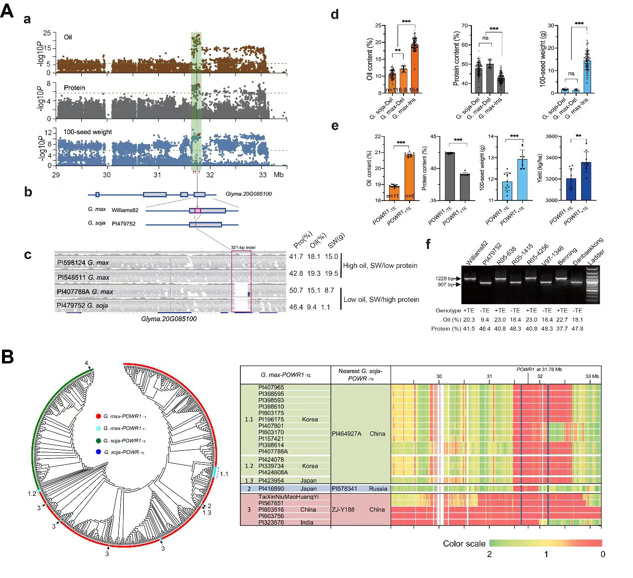 本研究利用經(jīng)典連鎖QTL分析結(jié)合基因組測序數(shù)據(jù)聯(lián)合分析,鑒定到位于20號染色體的一個主效QTL cqPro-20。該QTL自1992年首次鑒定,在不同遺傳背景中被鑒定到,但基因不清楚,發(fā)掘其控制基因一直是大豆蛋白研究的主要內(nèi)容。研究發(fā)現(xiàn)一個編碼CCT結(jié)構(gòu)域的基因POWR1(Protein, Oil, Weight Regulator 1)控制cqPro-20,一個321-bp轉(zhuǎn)座子在CCT結(jié)構(gòu)域的插入/缺失是該位點引起蛋白和油脂變異的主因(圖1A)。通過群體基因組學(xué)、近等基因系和大豆遺傳轉(zhuǎn)化研究證實POWR1調(diào)控蛋白質(zhì)和油份含量,同時影響粒重和田間產(chǎn)量;突變和野生型分別控制高油和高蛋白表型,從遺傳上解釋了部分蛋-油負相關(guān)遺傳基礎(chǔ)。研究也表明POWR1是大豆馴化的重要基因之一,高油基因型受到強烈選擇,推斷對高油基因型的強烈選擇主要是由于對大籽粒的優(yōu)先選擇而導(dǎo)致。高蛋白基因型在栽培大豆中含量很少且主要分布在亞洲,并且在POWR1位點有明顯的基因?qū)牒圹E(圖1B),推測與本地高蛋白育種需求有關(guān),符合亞洲自古都是大豆蛋白主要消費地的認識。這項研究為闡明大豆蛋白質(zhì)和油份的分子調(diào)控機制以及高蛋白的精準(zhǔn)分子育種帶來了機遇。