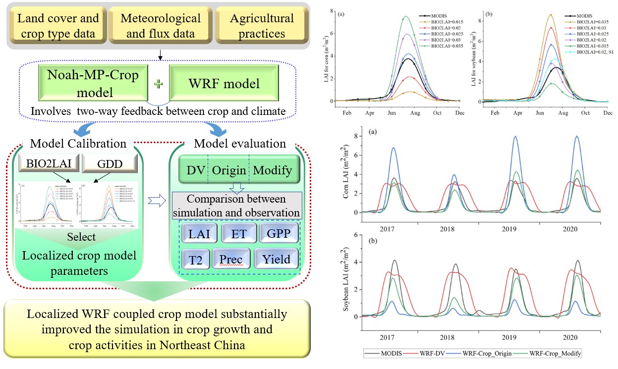 研究成果于近期以“Coupling localized Noah-MP-Crop model with the WRF model improved dynamic crop growth simulation across Northeast China”為題在Computers and Electronics in Agriculture上發(fā)表,由中科院東北地理所于靈雪副研究員、卜坤高級工程師、鄭興明副研究員、張樹文研究員,美國太平洋西北國家實(shí)驗(yàn)室劉野博士,長春師范大學(xué)劉廷祥博士,中國科學(xué)院大氣物理研究所于恩濤博士、中國氣象局大氣環(huán)境研究所賈慶宇博士、中國科學(xué)院沈陽生態(tài)研究所沈歷都博士等共同完成。該研究得到了中國科學(xué)院戰(zhàn)略性先導(dǎo)科技專項課題(XDA28080500),國家自然科學(xué)基金、吉林省科學(xué)基金、中國科學(xué)院東北地理與農(nóng)業(yè)生態(tài)研究所創(chuàng)新團(tuán)隊項目的資助。