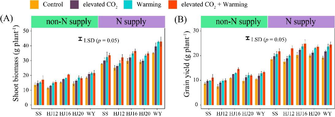 圖1 大氣CO2濃度和溫度升高條件下5個(gè)品種水稻的生物量(A)和產(chǎn)量(B)