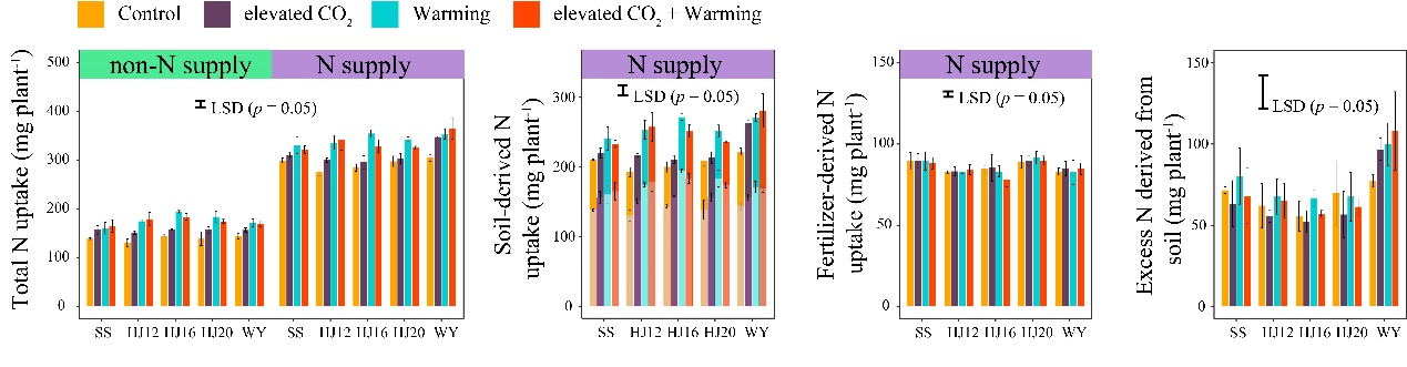 圖2 大氣CO2濃度和溫度升高條件下,5個(gè)品種水稻的總氮吸收以及來(lái)源土壤和肥料的氮吸收