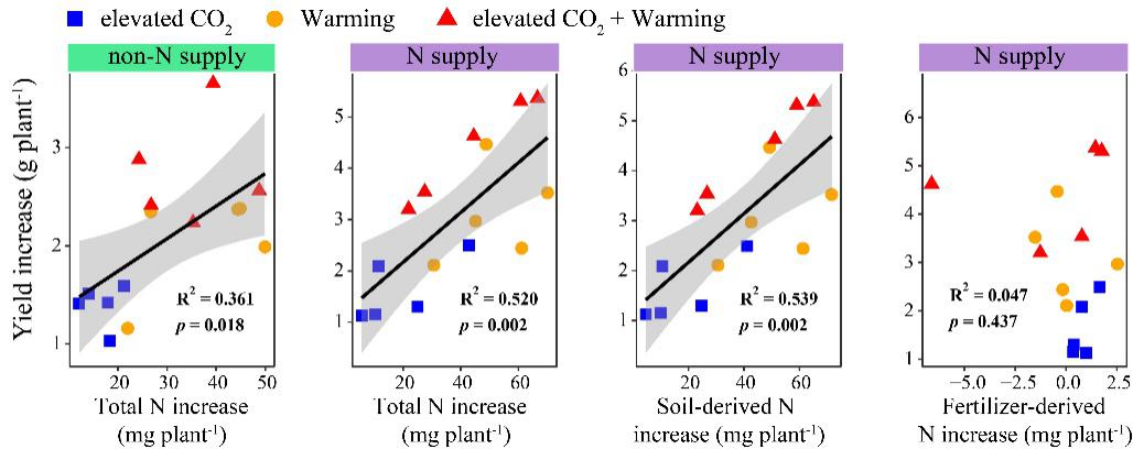 圖3 大氣CO2濃度和溫度升高條件下,氮吸收增加量與產(chǎn)量增加的相關(guān)性