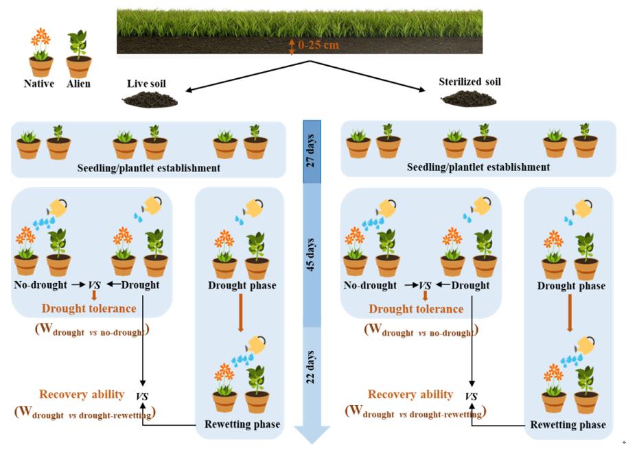 基于以上研究空白,中科院東北地理所生物入侵生態(tài)學(xué)研究團(tuán)隊(duì)設(shè)計(jì)了一個溫室盆栽實(shí)驗(yàn)(圖1):將4對同屬的外來入侵植物與本地植物單獨(dú)種植,并對其進(jìn)行水分控制(正常澆水 vs. 干旱 vs. 干旱-再濕潤處理) × 土壤滅菌(滅菌 vs. 不滅菌)的全因子處理。