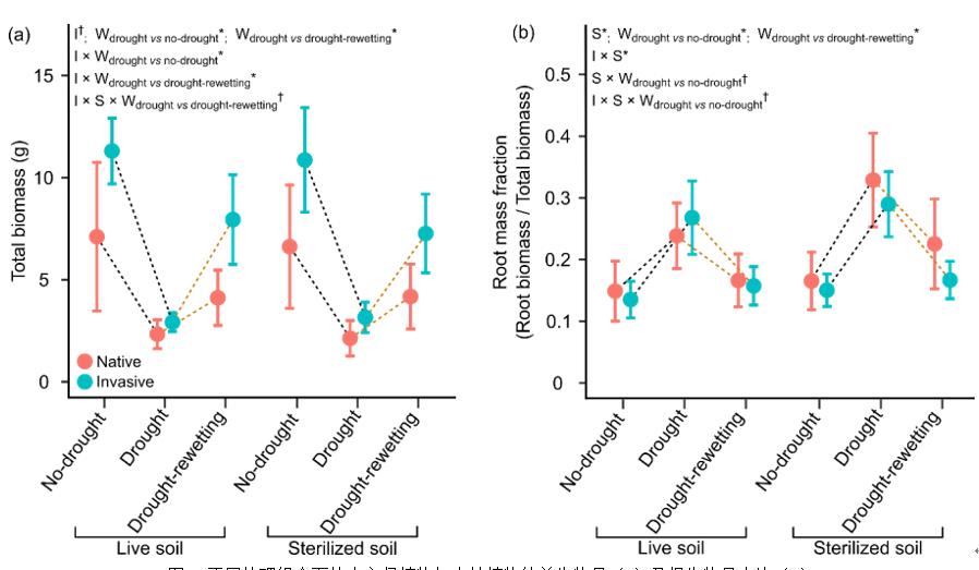 因此,盡管干旱可能會抑制外來入侵植物的競爭優(yōu)勢,但是干旱-再濕事件與土壤微生物卻協(xié)同加劇了外來入侵植物對本地植物的生長優(yōu)勢,促進(jìn)植物入侵。