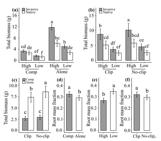 (1)在無競爭和模擬蟲食處理下,高水平的養(yǎng)分添加對外來入侵植物總生物量的促進作用顯著高于本地植物,而有競爭存在時則呈現(xiàn)出相反的結果(圖1a,b)。單種時,模擬蟲食會顯著的植物的總生物量,但存在競爭時,模擬蟲食對植物的總生物量無顯著影響。此外,競爭和模擬蟲食顯著地增加了植物的根質比,而高養(yǎng)分添加顯著降低了植物的根質量比。