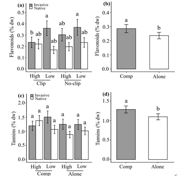 (2)競爭可以誘導植物分泌更多的類黃酮和單寧(圖2b, d)。模擬蟲食處理下,相較于低養(yǎng)分添加,高養(yǎng)分添加會顯著降低外來植物葉片中的類黃酮含量,而對本地植物葉片中的類黃酮含量無顯著影響(圖2a)。