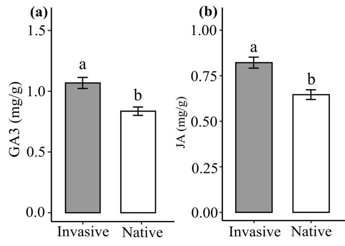 (3)外來入侵植物葉片中的赤霉素和茉莉酸含量高于本地植物(圖3a, b)。