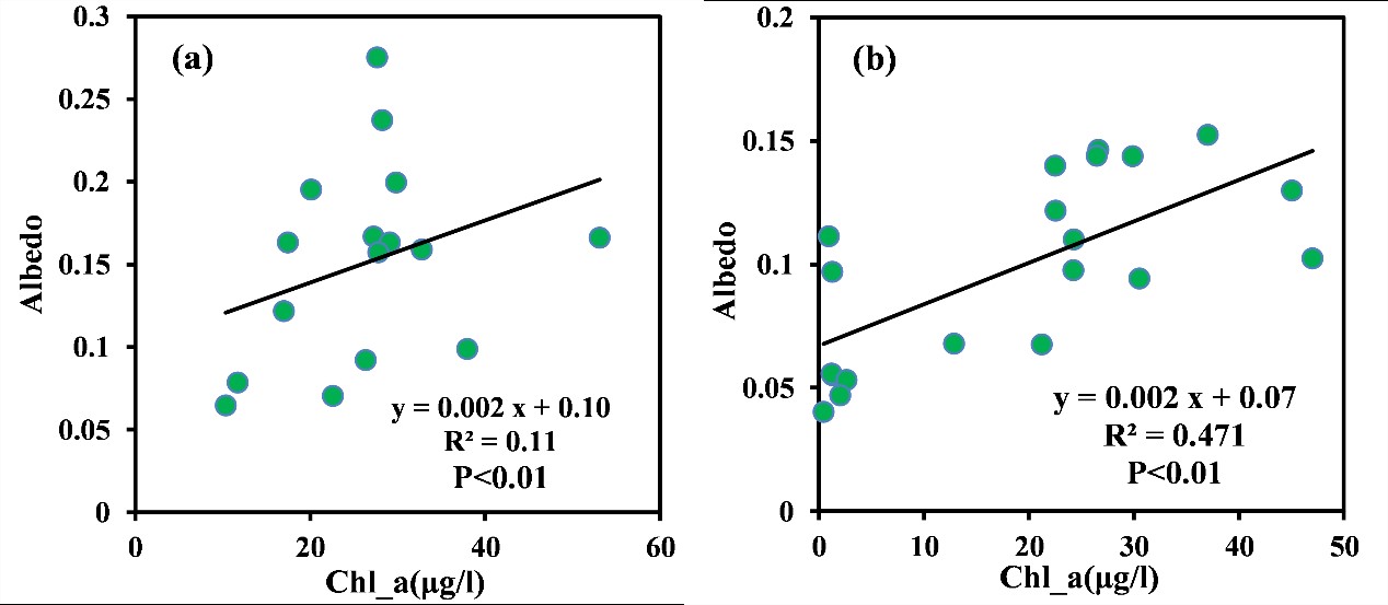 影響因素方面:①太陽高度角是湖泊反照率變化的首要控制因子。湖泊反照率隨著太陽高度角增大而降低;② 在不同太陽高度角區(qū)間內(nèi),湖泊反照率值均呈現(xiàn)隨懸浮物濃度升高而增大的趨勢(shì)。對(duì)于總懸浮物中無機(jī)顆粒物占主導(dǎo)的水體,其內(nèi)部反射的散射輻射量主要由水體內(nèi)的無機(jī)懸浮物含量決定,而后者能將部分透射進(jìn)入水體中的太陽短波輻射經(jīng)后向散射重新返回大氣。③ 湖泊反照率和葉綠素a濃度(Chl-a)在低太陽高度角時(shí)無明顯相關(guān)性。在高太陽高度角時(shí),反照率呈現(xiàn)隨Chl-a濃度升高而升高的正相關(guān)關(guān)系,但相較于懸浮物濃度對(duì)湖泊反照率大小的貢獻(xiàn)程度,Chl-a濃度要小得多。④ 風(fēng)浪通過影響淺水湖泊懸浮物濃度從而間接影響湖泊反照率。⑤ CDOM和顆粒物吸收在較短波長具有強(qiáng)吸收作用,影響入射太陽輻射的分配及其光譜分布。但并無足夠證據(jù)表明CDOM和顆粒物吸收會(huì)使湖泊反照率降低,本研究區(qū)內(nèi)湖泊反照率的變化主要取決于無機(jī)顆粒物的后向散射特性。