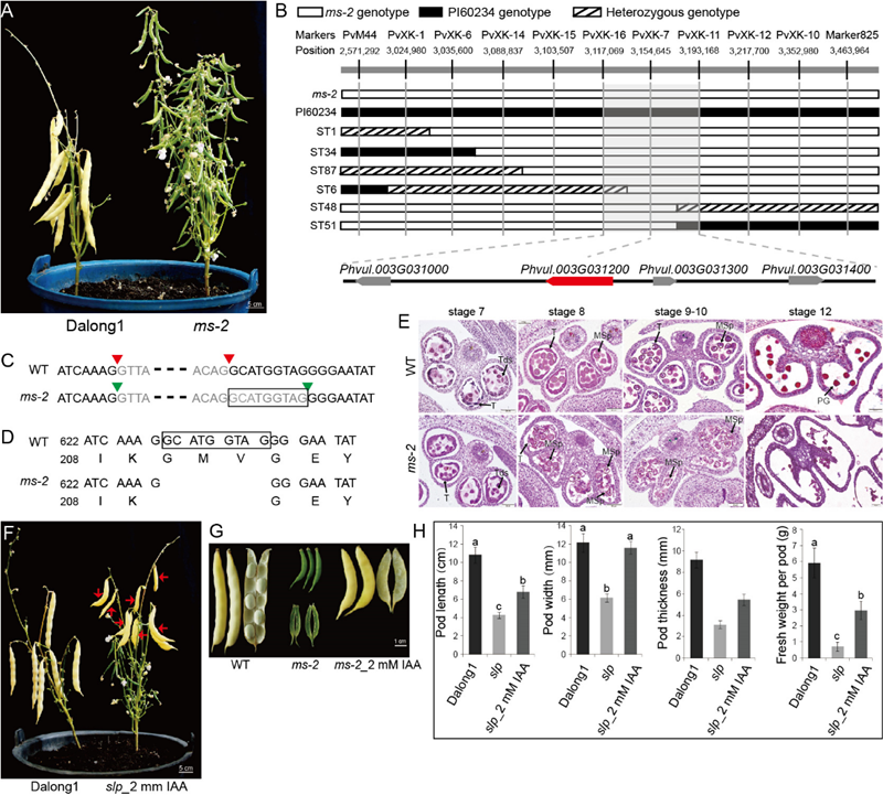 東北地理所研究團隊利用SNP測序和自主設(shè)計的菜豆InDel分子標(biāo)記,通過圖位克隆的方法精細定位了菜豆雄性育性基因MS-2為Phvul.003G031200基因(圖B);在ms-2突變體中Phvul.003G031200基因剪切位點發(fā)生變異,使得蛋白質(zhì)序列缺少3個氨基酸(圖C-D);利用石蠟切片對小孢子體發(fā)育過程進行觀察,發(fā)現(xiàn)MS-2基因的剪切位點變異導(dǎo)致絨氈層降解提前是ms-2突變體雄性不育的原因(圖E)。ms-2突變體可結(jié)實大量的無籽肉莢,外源噴施2 mM生長素物質(zhì)吲哚乙酸(IAA)能使ms-2突變體上的肉質(zhì)無籽莢的莢長、莢寬、莢厚和單莢鮮重顯著增加(圖F-H),體積增大的無籽肉莢具有加工或直接食用的潛能。本研究定位與克隆了菜豆雄性育性基因MS-2.明確了該基因突變導(dǎo)致菜豆不育的機理。MS-2基因可應(yīng)用于培育肉質(zhì)無籽莢菜豆品種,具有很好的應(yīng)用價值,同時為雜種優(yōu)勢的利用奠定了堅實的理論基礎(chǔ)。