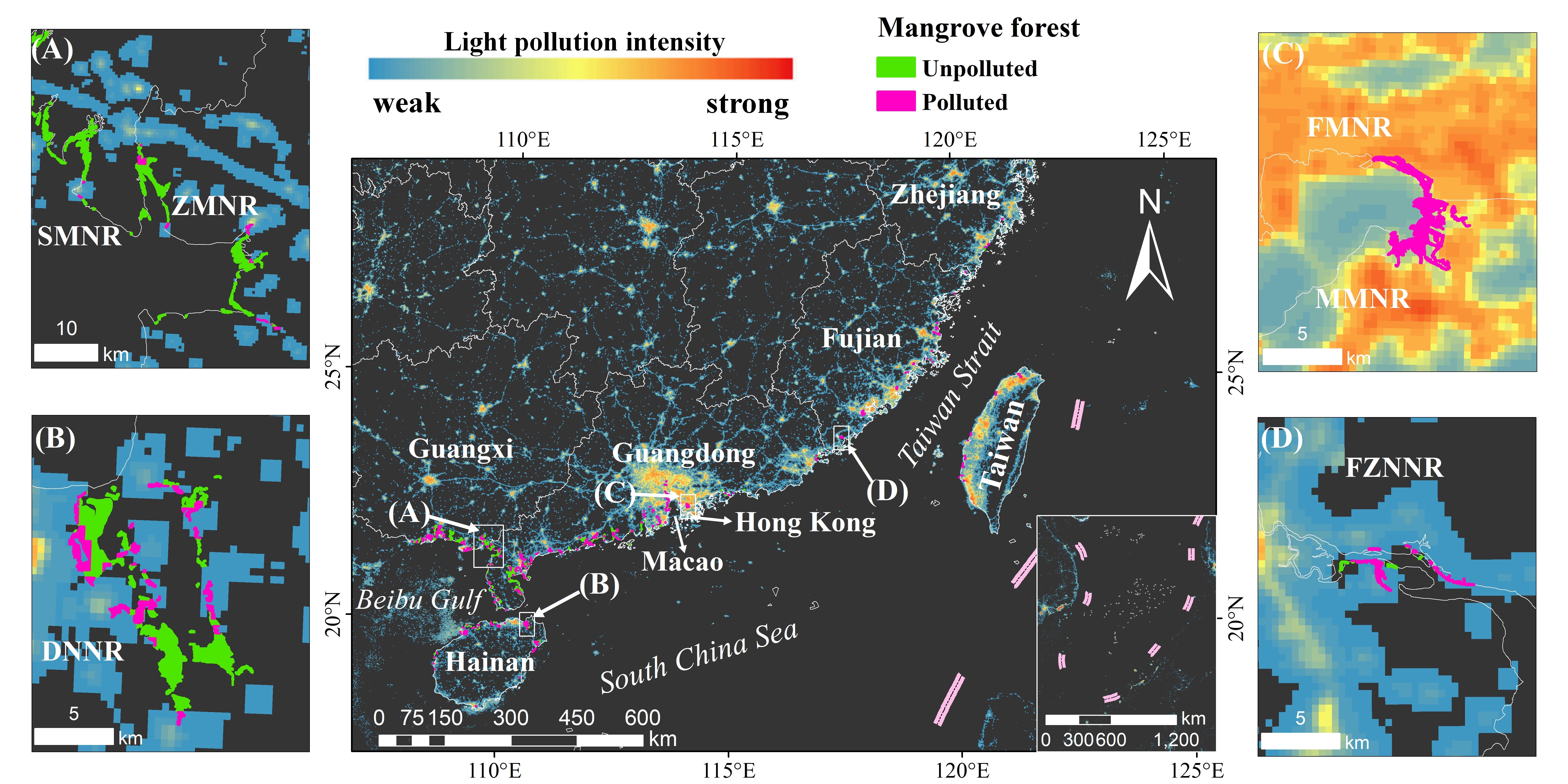Zeng, H., Jia, M., Zhang, R., Wang, Z., Mao, D., Ren, C., & Zhao, C. Monitoring light pollution changes of China's mangrove forests during 1992-2020 using nighttime light data. Frontiers in Marine Science, 10, 733.