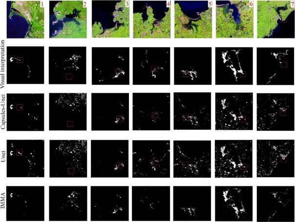 圖 紅樹林遙感識(shí)別方法IMMA與深度學(xué)習(xí)分類結(jié)果的比較。其中,目視解譯、Capsules-Unet、Unet結(jié)果均來自于Guo et al. (2021)。