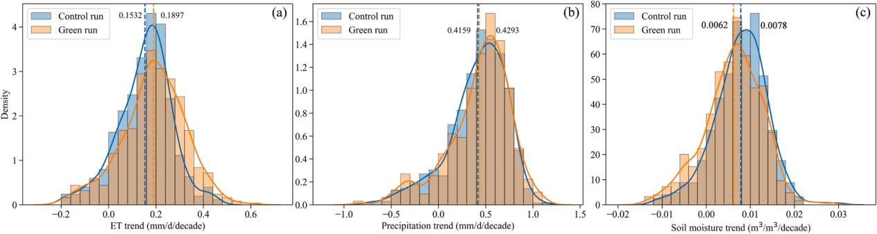 圖2. 2001-2020年東北地區(qū)農(nóng)田生長季蒸散、降水和土壤水分變化趨勢核密度圖(農(nóng)田變綠:橙色,控制實驗:藍色)