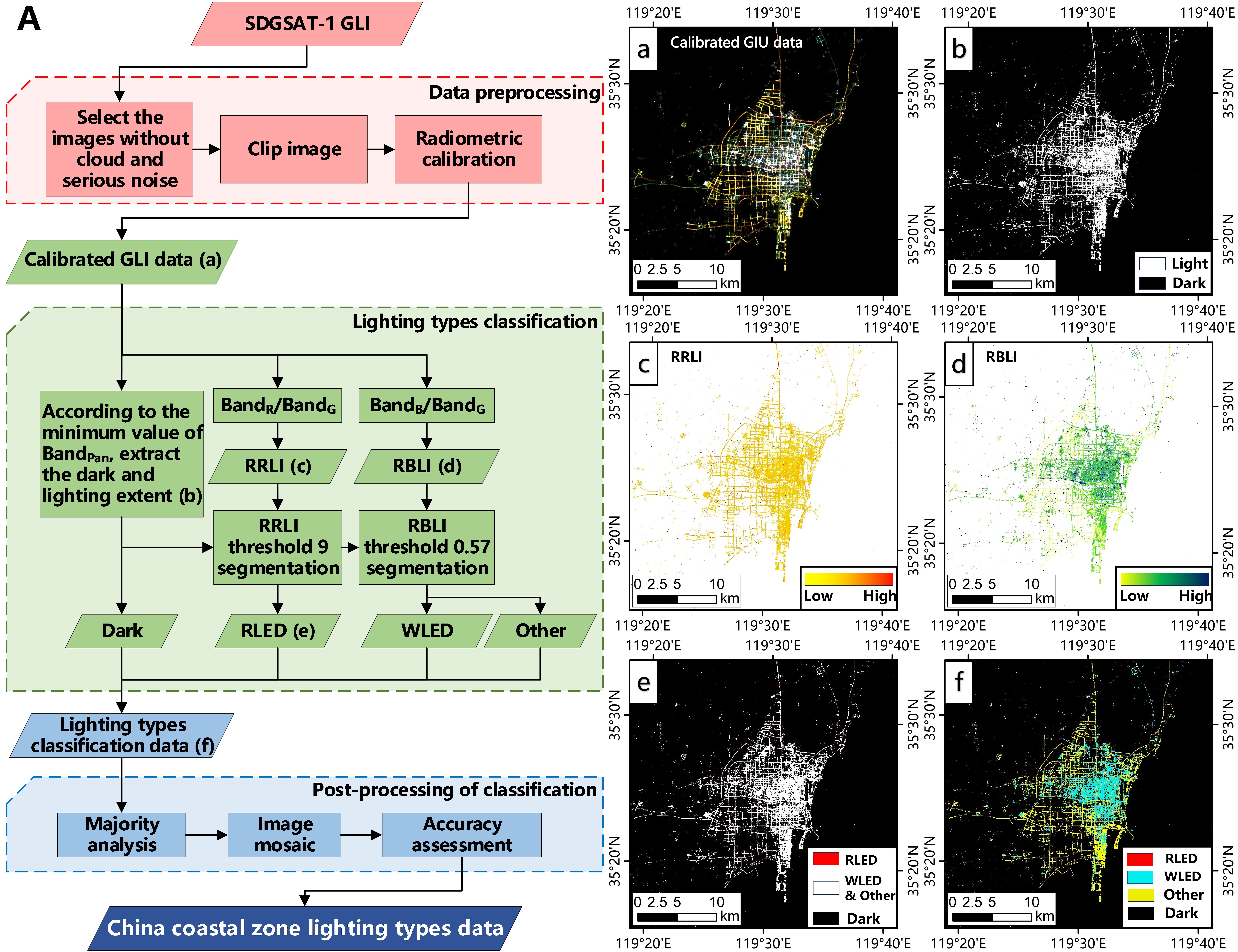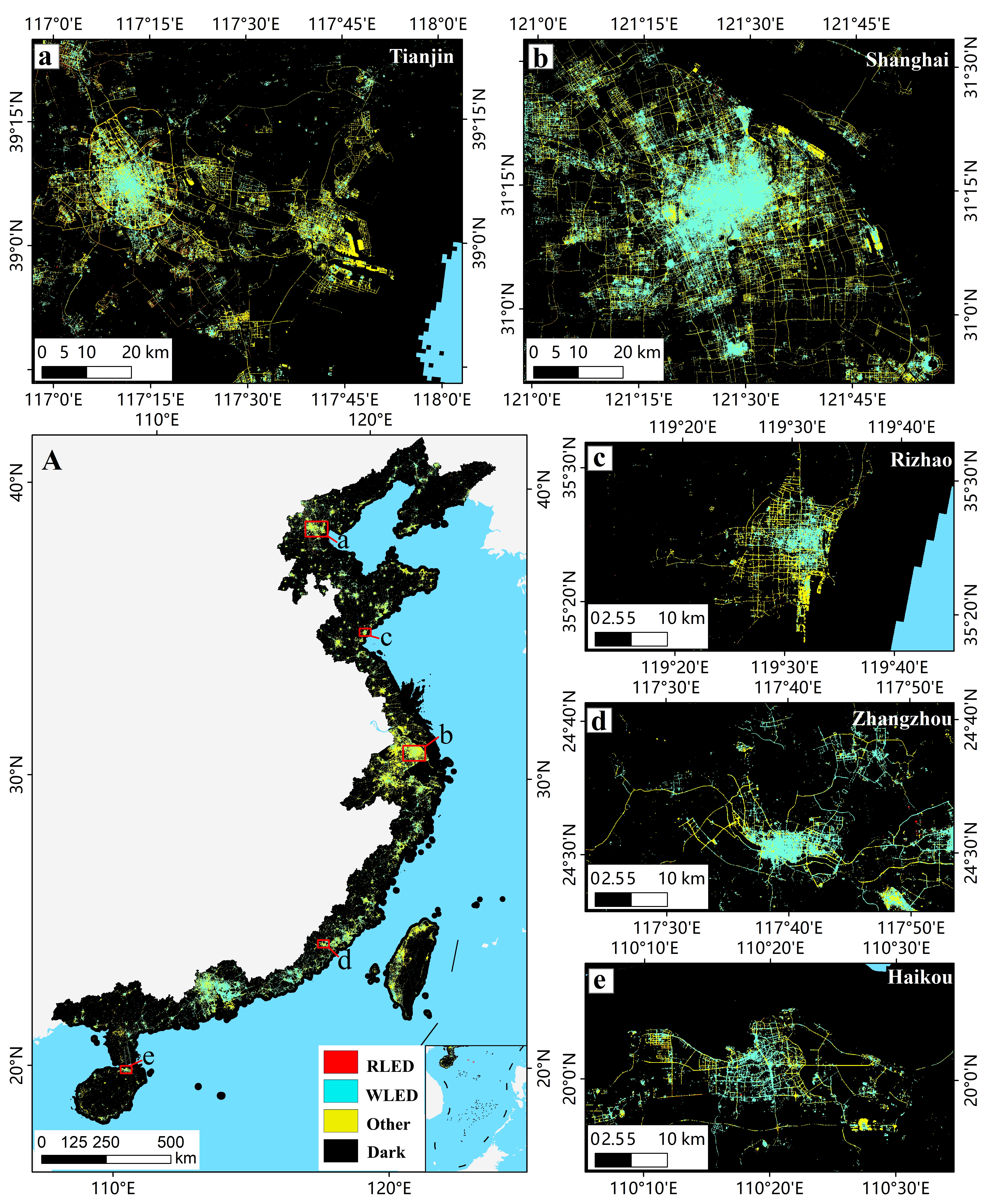 這項(xiàng)研究首次嘗試以高分辨率彩色微光數(shù)據(jù)進(jìn)行大尺度夜間燈光類型分類,所提出的RRLI和RBLI兩種燈光指數(shù),以及定義的分割閾值,具有通用性和魯棒性。這項(xiàng)研究發(fā)布的照明類型圖包含了夜間燈光的空間分布和組成信息,可以為促進(jìn)中國(guó)沿海地區(qū)的生態(tài)可持續(xù)發(fā)展提供科學(xué)依據(jù)和數(shù)據(jù)支撐。