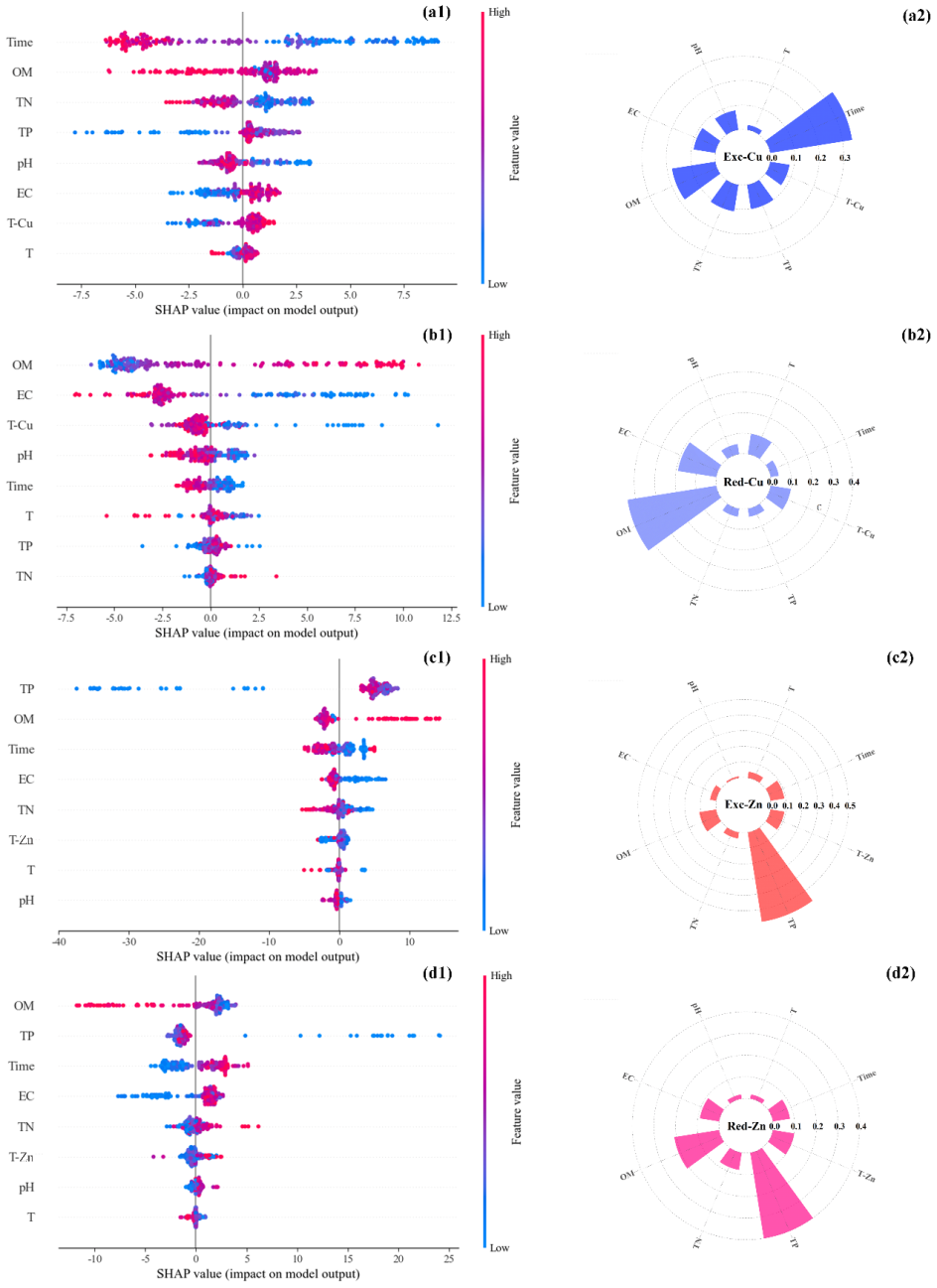 本研究基于課題組15年的數(shù)據(jù)累積及外部數(shù)據(jù)的收集,共取得260組數(shù)據(jù)。以堆肥過程中常見的物質(zhì)變化指標(biāo)(堆肥時(shí)間、溫度、pH、EC、OM、TP、TN和重金屬總量)為輸入因子,借助反向傳播神經(jīng)網(wǎng)絡(luò)(BPNN)、梯度增強(qiáng)回歸模型(GBR)、隨機(jī)森林模型(RF),建立了堆肥過程中重金屬形態(tài)快速預(yù)測模型,從而對(duì)重金屬有效性進(jìn)行評(píng)估。研究結(jié)果表明:BPNN、GBR和RF模型均能預(yù)測堆肥過程中Cu和Zn的形態(tài)分布(圖1),其中RF的預(yù)測性能最好,R2值為0.93-0.97。同時(shí),輸入因子的特征性分析表明(圖2),除堆肥時(shí)間外,OM和TP分別是預(yù)測Cu和Zn有效形態(tài)的最重要特征,降低OM或增加TP有助于提升堆肥中Cu和Zn的鈍化能力。本研究識(shí)別了Cu和Zn生物有效形態(tài)之間轉(zhuǎn)化的主要影響因子,為評(píng)估堆肥生產(chǎn)中重金屬生物有效性評(píng)估及調(diào)控提供了一種快速的決策工具;同時(shí)拓展了人工智能方法在有機(jī)固廢資源化領(lǐng)域的適用性,對(duì)于構(gòu)建生態(tài)安全的種養(yǎng)結(jié)合、農(nóng)牧循環(huán)新格局具有重要推動(dòng)意義。